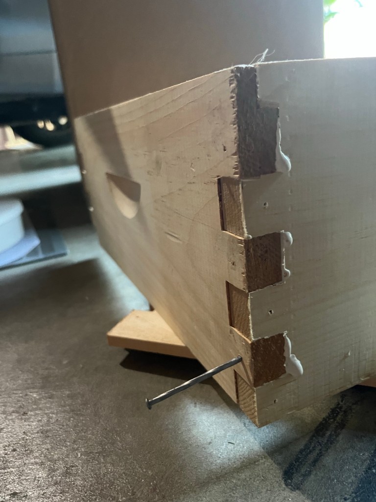 - Attach the Corners with wood glue and finishing nails using your nail gun. Let the glue dry for a few hours.
